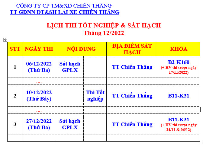 LỊCH THI TỐT NGHIỆP VÀ SÁT HẠCH LÁI XE THÁNG 11/2022