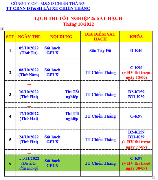 LỊCH THI TỐT NGHIỆP VÀ SÁT HẠCH LÁI XE THÁNG 11/2022